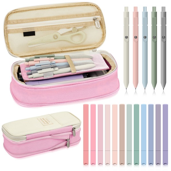 18 Pcs Aesthetic School Supplies Include Big Capacity Pen Case Bag with Zipper 12 Pcs Chisel Tip Aesthetic Cute Highlighters 5 Pcs Quick Dry Retractable Black Ink Pens for Students(Pink)