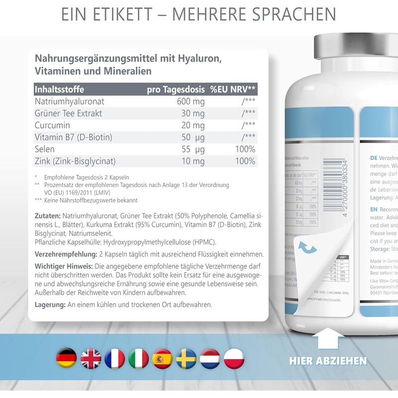 - Highest quality – made in Germany – trust in our laboratory-tested top quality. Test winner in RTL and expert tests, awarded with GMP, ISO and HACCP. Try our hyaluronic capsules with zinc and benefit of the best quality!