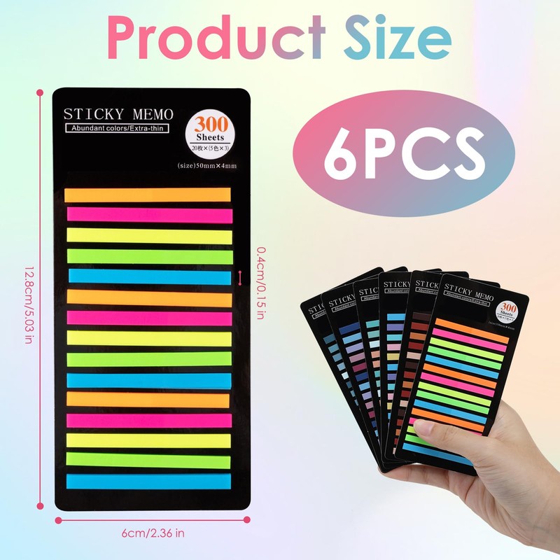 - 【Paquete valioso】Un conjunto de 300, 6 juegos de pestañas 1800 piezas para cuadernos, 1.98 * 0.16 pulgadas X 6 juegos, fácil de marcar y resaltar información importante.Super gran cantidad puede satisfacer sus necesidades de tomar notas o clasificar archivos.