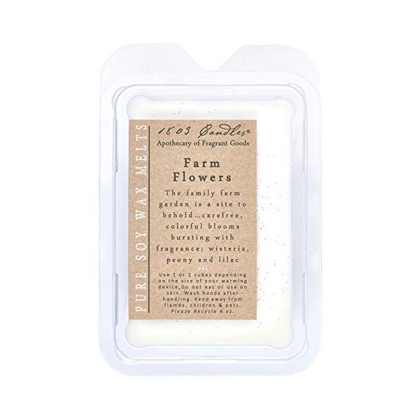 Scent Description: wisteria, peony, and lilac. Soy wax melters add Fragrance without a Flame to any room. We generously hand-pour our melters into a resealable packaging that features six squares of your signature 1803 Candles scent. Each melt is topped with dried botanicals to add an enriching touch of texture and beauty. We use pure soy wax from soybeans grown in the USA and blend it with the finest fragrances available. To use, we suggest adding one to two melter squares depending on the depth of your warmer. Soy Wax Melters Fragrance Time Two squares are approximately 6-8 hours of fragrance time. Size of warmer and bulb wattage will cause varying results. Soy Wax Melters Exclusive Features Easy Breakaway Packaging Six Squares per Package Convenient Size Fragrance without a Flame Hand-Poured Soy Wax Biodegradable Made in the United States Non-Toxic Topped with an Accent of Botanicals Works in Most Wax Warmers Perfect for Sampling a Scent Environmentally Friendly