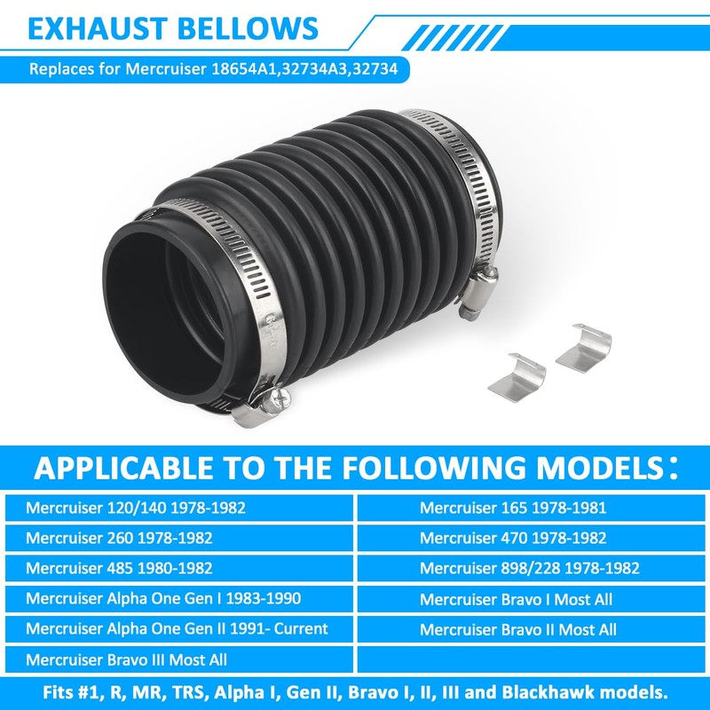 - Replacement parts:Exhaust bellows suitable for Mercruiser R, MR, Alpha One, Alpha One Gen ll, Bravo 1, 2, and 3, as well as Blackhawk drives. These corrugated tubes have replaced part numbers 32734, 32734A3, and 18654A.