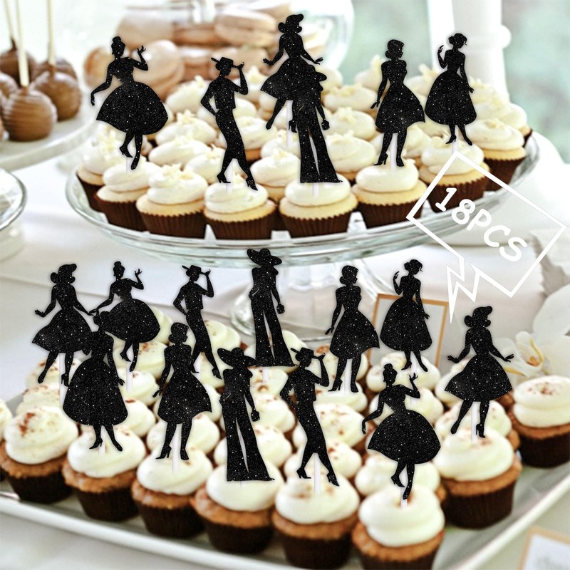 18pcs Black Silhouette Glitter Lady Dessert Cupcake Topper Pick for Makeup Princess Queen Party Theme Decor Supplies Women Girls Happy Birthday Anniversary Wedding Party Decoration