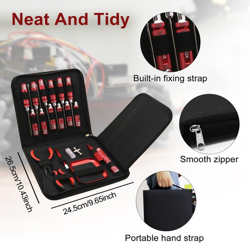 - 19 pieces complete RC tool bags: 4 x hex screwdrivers (1.5 mm 2.0 mm 2.5 mm 3.0 mm), 4 x hex nut screwdrivers (4.0 mm 5.5 mm 7.0 mm 8.0 mm), 2 x Phillips screwdrivers (3.0 mm + 4.0 mm+), 2 x slotted screwdrivers (3.0 mm - 4.0 mm), 2 x slotted screwdrivers (3.0 mm * * Pli* * Pli* nose, diagonal), 1 x body hole reamer, 1 x craft knife (with 6 blades), 1 x RC cross key, 1 x RC ball bearing driver, 1 x RC screw shell and 1 x storage bag. Can meet your different needs!