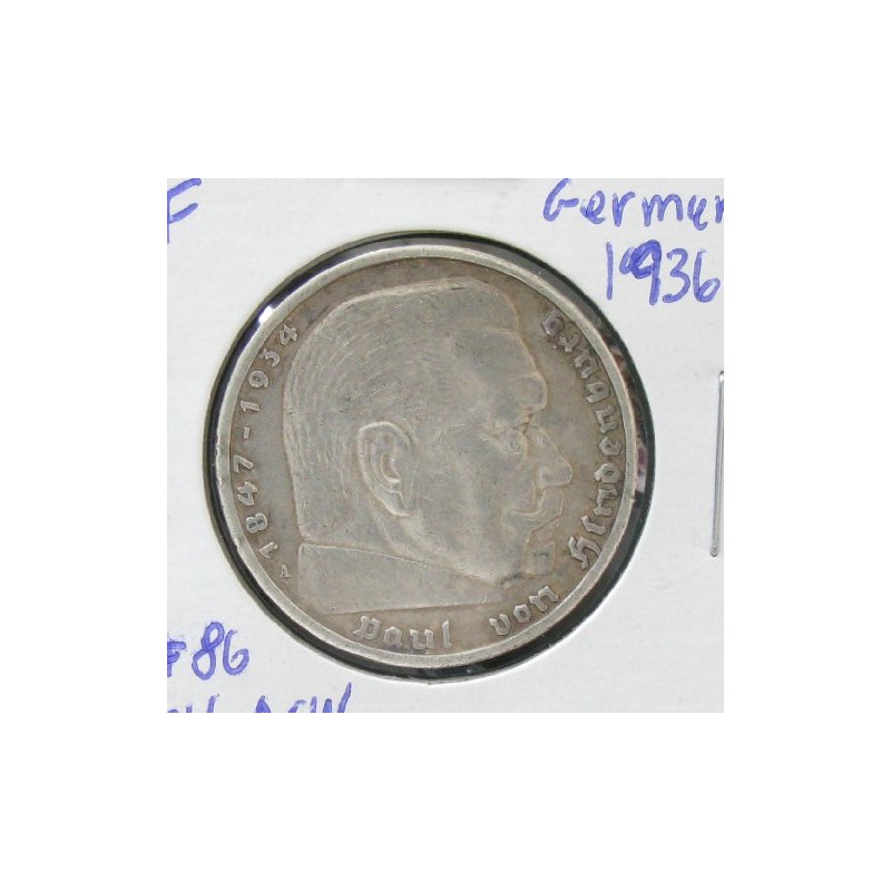1936-A German 5 Mark 3rd Reich; KM#86; Silver