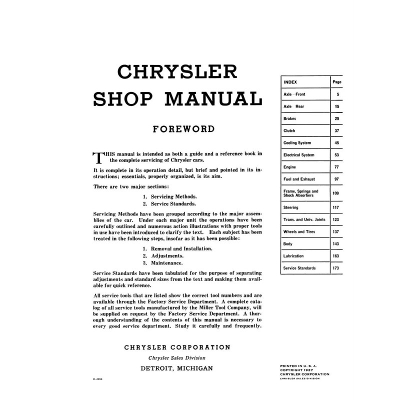 With the 1938 Chrysler Shop Manual in your toolbox, you have the most comprehensive literature at your fingertips to take on the most challenging repair, service and restoration projects. This factory-written Detroit Iron shop manual is perfect for the restorer or anyone working on one of these vehicles.