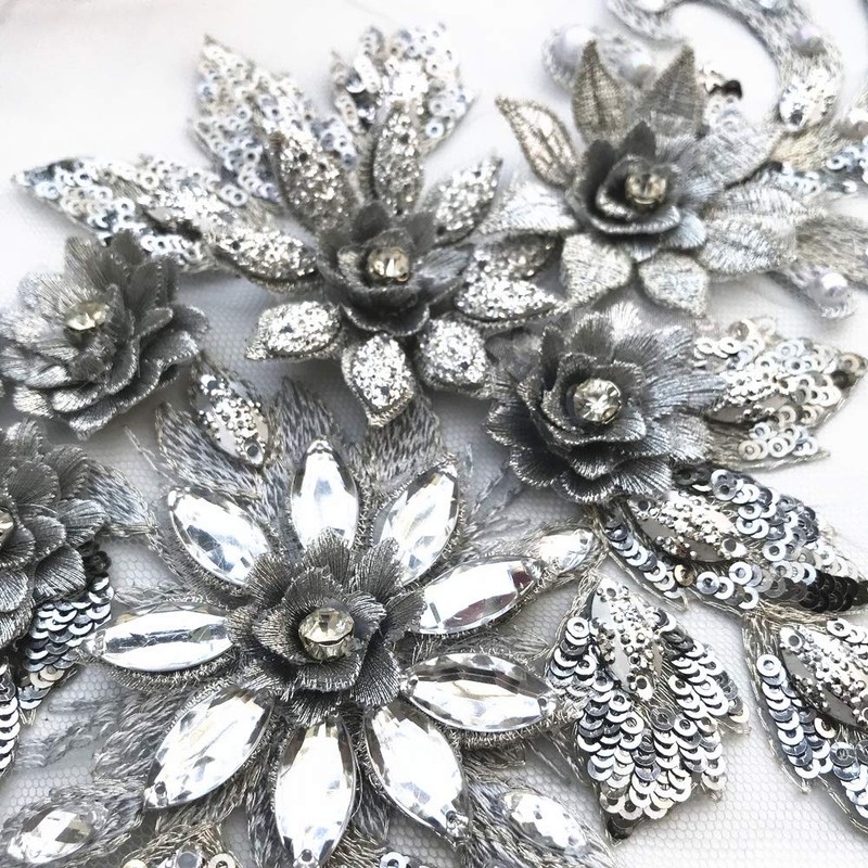 1938cm 3D Colorful Flower Mesh Embroidered Rhinestone Lace Beaded Applique with Sequins DIY Lace Fabric Trim for Clothes Accessories Hardware (Gray)