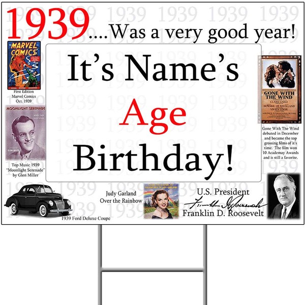 Each - 1939….was a very good year. Customize this yard sign with an age and a name. Our yard signs match the popular pop culture banners and are made of heavy-duty plastic board on an easy one step stake. Sign measures 16 inches x 13 inches and stands over 2 feet tall (with stake).
