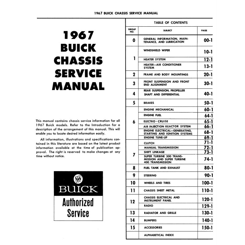 With the 1967 Buick Chassis Service Manual - All Series in your toolbox, you have the most comprehensive literature at your fingertips to take on the most challenging repair, service and restoration projects. This factory written Detroit Iron shop manual is perfect for the restorer or anyone working on one of these vehicles.