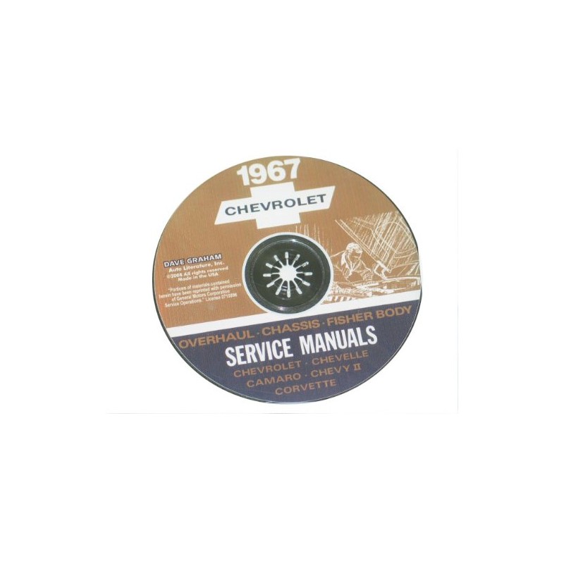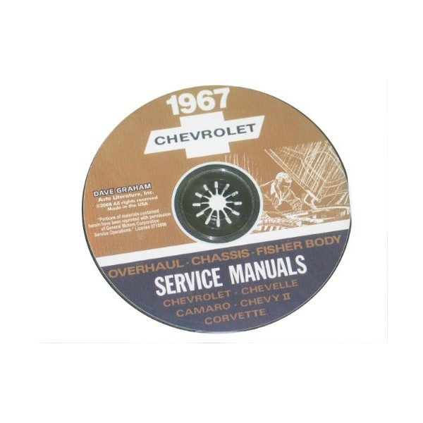 This CD-ROM offers page-for-page reproductions of three bound manuals that Chevrolet mechanics used to service vehicles. It includes the: 657 page “1967 Chassis Service Manual”, the 325 page “1967 Chassis Overhaul Manual”, and the 596 page “Body by Fisher 1967 Service Manual”. In the service manual you will find detailed service procedures for frame, front suspension, rear suspension, driveline, brakes, engine cooling, engine fuel, electrical, clutch, transmission, fuel tank, exhaust system, steering, wheels, tires, chassis sheet metal, radiator, grille, heating, air-conditioning, Corvette body, and air-injector reactor systems. In the overhaul manual you will find step-by-step instructions for tearing down & rebuilding the air-conditioning compressor, rear axle, differential carrier, power brake cylinders, engine, water pump, carburetors, air injection pump, start motor, clutch & transmission, and steering. In the Fisher Body Manual you will find service procedures for lubrication, front end, doors, rear quarter, rear end, head lining, seats, folding top, fabric roof cover and electrical. With the step-by-step illustrated instructions, specifications, and wiring diagrams on this CD, you will have the information you need to get your project on the road and keep it there. You can use the information on this CD to restore 1967 Chevrolet Biscayne, Bel Air, Caprice, Impala, Super Sport, station wagons, Chevelle, Chevelle 300 Deluxe, Malibu, Concours, Chevelle SS-396, El Camino, Chevy II, Nova, Camaro, RS, SS, Z28, and Corvette. Buy now to own the best manuals for your vehicle on CD. We have manuals on paper also -- see our other items.