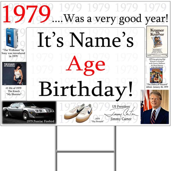 Each - 1979….was a very good year. Customize this yard sign with an age and a name. Our yard signs match the popular pop culture banners and are made of heavy-duty plastic board on an easy one step stake. Sign measures 16 inches x 13 inches and stands over 2 feet tall (with stake).