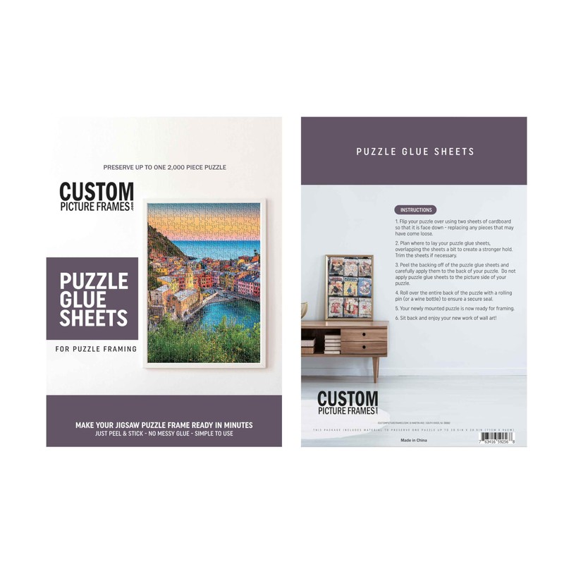 - 🧩 This Jigsaw Puzzle Frame Kit Includes a Complete Solid Wooden Picture Frame (with a Protective UV Acrylic Front & Acid-Free Foam Board Backing) AND a Set of Peel and Stick Puzzle Glue Sheets!