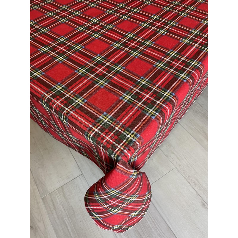 - Christmas tablecloth with classic design in modern design. Tartan fabric on red background with glitter effect (Lurex).