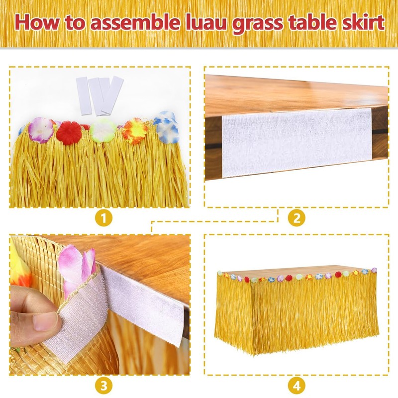 - Easy-to-Use Tropical Table Skirt – Simply drape these lightweight luau decorations over tables, package comes with 4 pairs of adhesive hoop and loop tapes. Folds compactly for storage and reuse at multiple events.