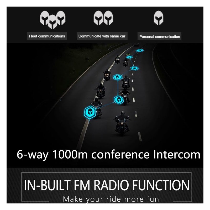 - Motorcycle Bluetooth Headset supports up to 3 riders intercom, 800 meter communication, 10 hr phone talk time, 7 hr intercom talk and 300 hr standby time;
