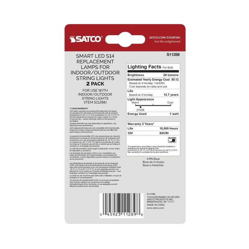 Satco 2Pk - 4-Pin S14 1W LED Replacement String Lamp Color RGBW Starfish IOT 12v LED color changing and warm-to-cool light replacement bulbs for Satco S11288 or S11272 Light String. Dimmable (with Starfish app), long lasting, wet location certified and portable for extra versatility. Replacement bulbs are sold separately in a convenient 2-Pack STARFISH Wi-Fi lighting products are controlled through the FREE downloadable STARFISH app. No hub is required and the app integrates with Alexa, Hey Google, Siri and SmartThings for voice control and advanced features and integrations. Features: