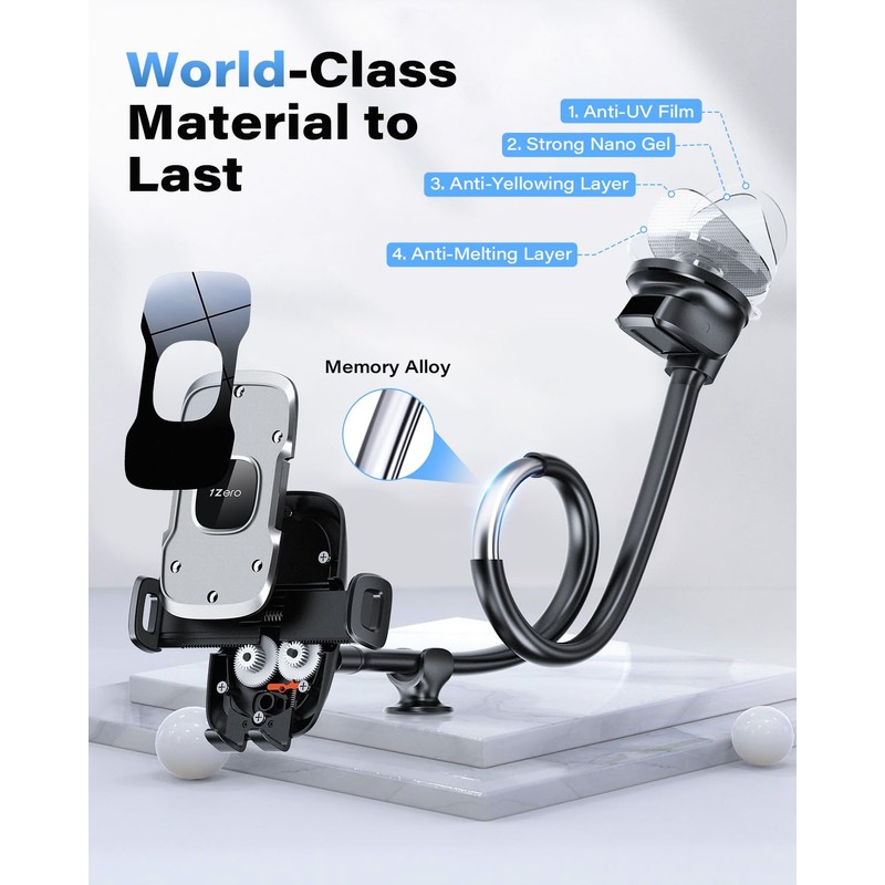 - Upgraded Universal Car Truck Phone Holder: 1Zero car truck phone mount has a 14 inches durable aluminum pipe that will work perfectly for most vehicles trucks SUVs and cars, and will hold your phone securely and close to your finger in your line of sight