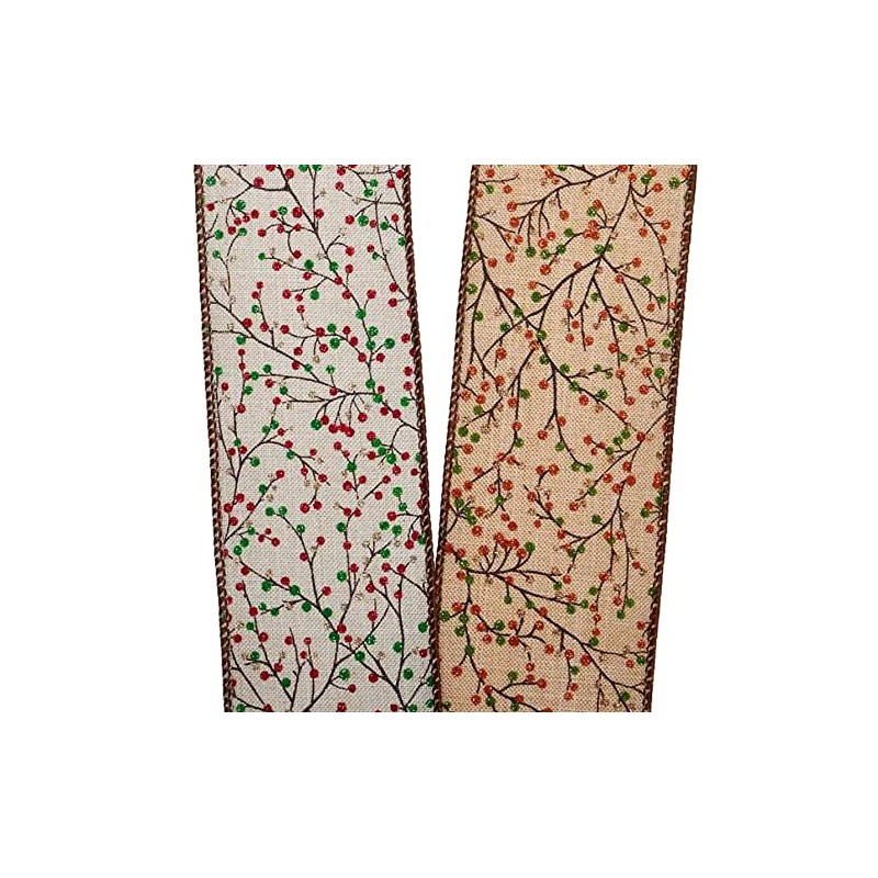 - Exceptional Style: This single-faced gift wrap ribbon features seasonal berries and branches on one side of a natural-look fabric body; its wired edges are overstitched with a coordinating thread