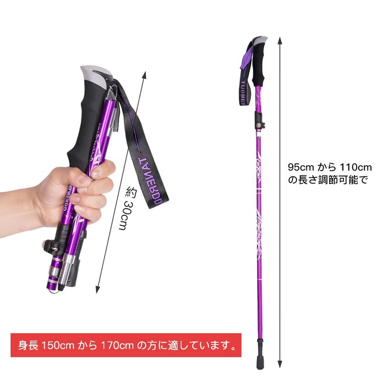 サムコス トレッキングポール 2個セット 付属品付き 折りたたみ式 30-110cm伸縮可 長さ調整可能 登山ストック ウォーキング ウォーキングポール 登山 杖 ステッキ ポール アウトドア 男女兼用 収納バッグ付き (パープル、ショート)