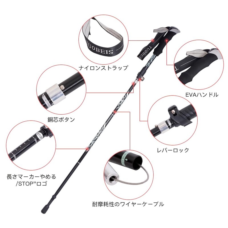 - 特徴:軽量で持ち運びが便利です。ご注意:スティックの胴を引くと、ロックが弾き出されていることを確認してください。インストール中に反復して折り曲げたり、過度な引張りを加えたりしないように注意してください。これにより、トレッキングポール内のワイヤーロープが切断される可能性があります。