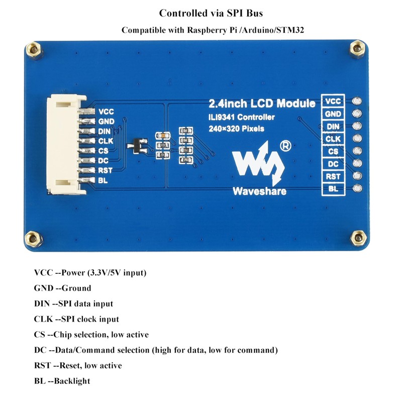 As a 2.4inch TFT display module with a resolution of 240 x 320, it uses the SPI interface for communication. LCD has an internal controller with basic functions, which can be used to draw points, lines, circles, and rectangles, and can display English, Chinese as well as pictures.