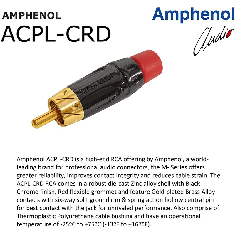 - Amphenol ACPL RCA/Phono plugs with Black chrome body are high-end, professional-grade RCA connectors. Gold plated Brass contacts enhance conductivity. Insulation prevents any shorting inside. Colored rubber flexible grommet grants best strain relief.