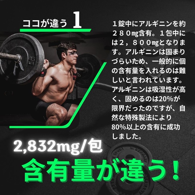 - ・飲みやすいタブレット:錠剤化が難しいアルギニンを80%以上含有するタブレットに成功し、飲みやすさと効果の両立を実現したアルギニンサプリメントです
