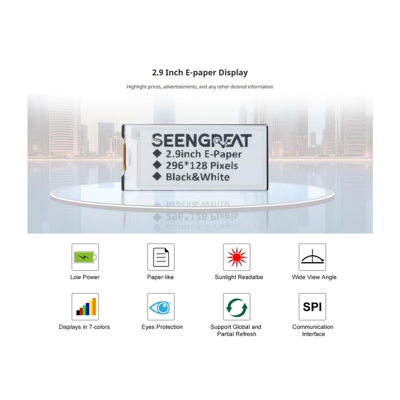 • High-Resolution E-ink Display – The 2.9 inch e-ink display module offers a 296x128 resolution, delivering clear and sharp visuals for displaying text, graphics, and images with ultra-low power consumption.