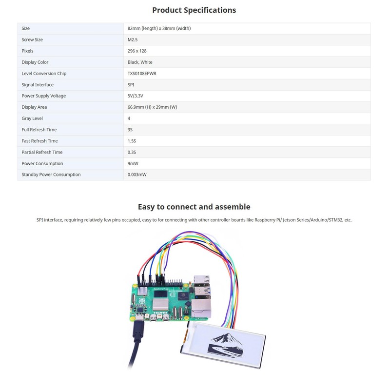 Raspberry Pi, Arduino, and STM32. With a resolution of 296x128 pixels, this e-paper display delivers crisp and clear visuals, making it ideal for projects requiring