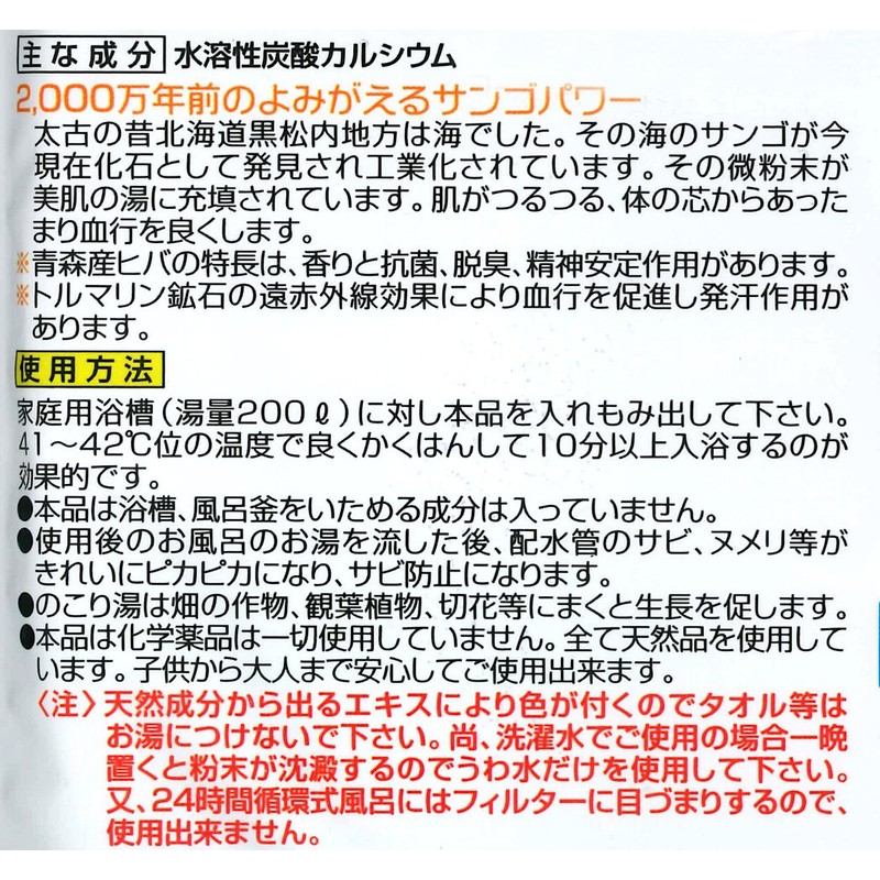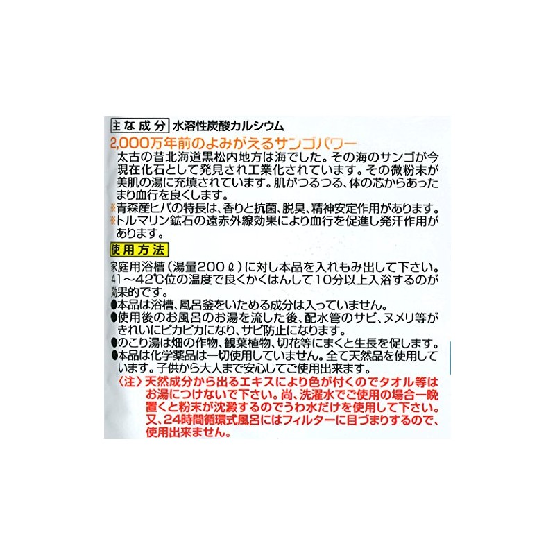 Please insert 1 bag per household bathtub (200 L). It is effective to have a good stirring at a temperature of about 41 - 42 degrees Celsius and bath for more than 10 minutes.