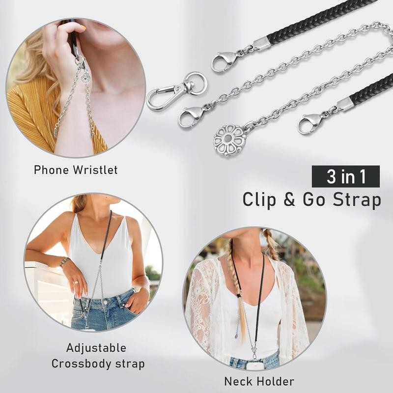 2-in-1 clip&go strap(Crossbody&Wrist Strap)-Our innovative design let you seamlessly combine crossbody phone chain & cell phone wrist strap into one convenient fashion accessory for women. You can choose adjustable crossbody phone strap or phone wrist lanyard to use whenever you want.The important is:the chain length is adjustable from 33 to 65 inches by metal buckles, offering flexibility for comfortable crossbody wear, you have slim or a plump figure