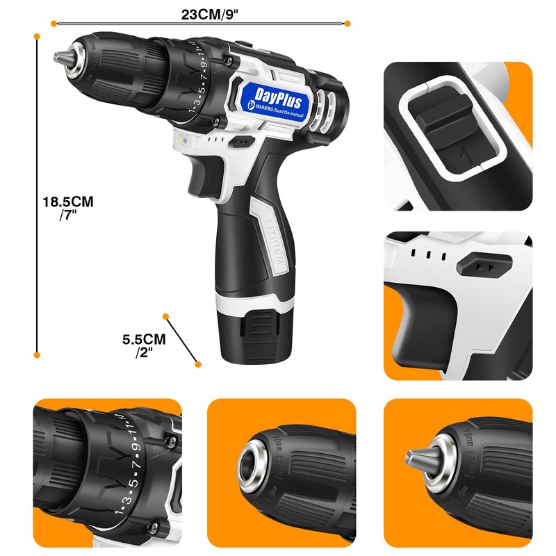 - âšăDrill Detailsăâ12V Cordless drill with 25+1 adjustable clutch settings, help complete a wide range of applications precisely. âTrigger-activated LED light can illuminate any enclosed workspace. â3/8ââ keyless chuck provides an automatic spindle lock that enables one-hand changing with great accessory compatibility. â Forward/Reverse switch allows you to either screw or replaces/remove bits for your purposes.