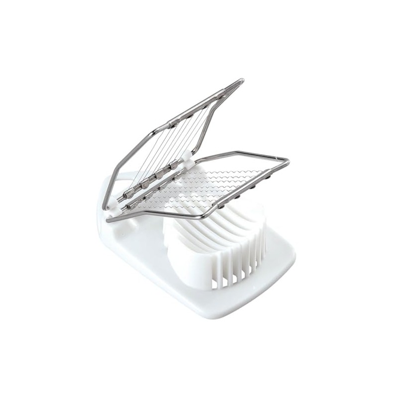 Enjoy perfect slices in seconds! Handy 2-In-1 Egg Slicer features 2 sets of blades for straight or wavy cuts. Simply place a peeled hardboiled egg on the curved base and press blade down. Also great for strawberries, kiwis, mushrooms, and other firm fruits and vegetables. Simplify food prep and create beautiful platters for your next party. Both blades store on the unit to prevent loss; pop off whichever blade you don't need when in use. Plastic and stainless steel slicer is dishwasher safe for easy cleanup and compact for easy storage. Boiled egg cutter tool measures 5 1/2" long x 3 1/4" wide.