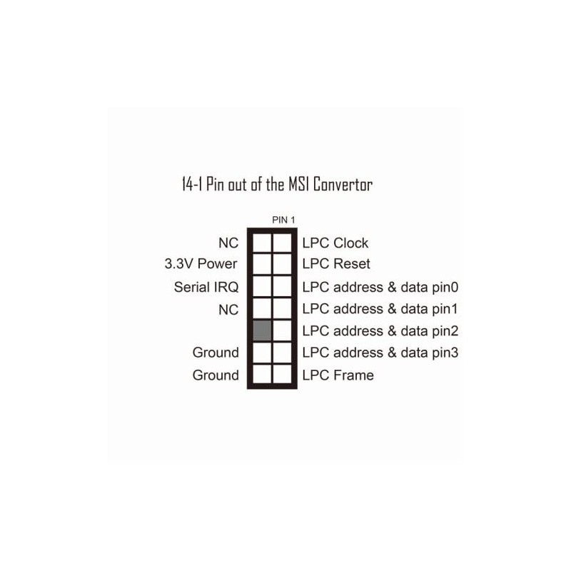 The module utilizes an LPC interface, not an SPI interface. It includes an MSI 14-1 pin TPM connector conversion card, allowing the conversion of the 14-1pin TPM header into a 20-1pin header, which can then be connected to the 2in1 TPM module.