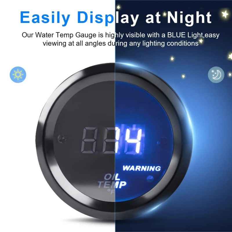 - 1.Easily display at night: Our oil temp gauge is highly visible with a BLUE Light,easy viewing at all angles during any lighting conditions,practically and safely when driving at night