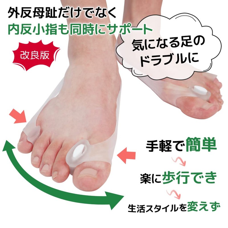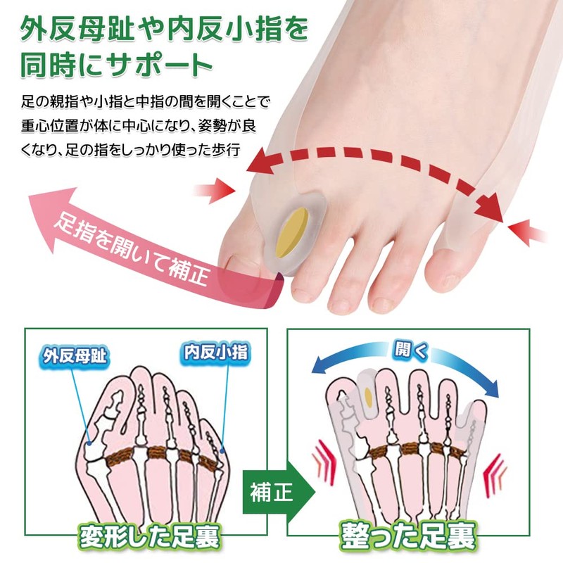 - 【適応対象】※(L23.5-25.5㎝)外反母趾、内反小趾でお悩みの方、足の親指と小指が内側に曲がっていて困っている方、親指と小指の付け根が痛い方、長時間の立ち仕事で疲れを感じている方、窮屈な靴を履く事が多い方、靴擦れなどのお悩み方にお勧めします。外反母趾と内反小趾による痛みや足の歪みを正常な状況へ矯正するのを助けます。※ご注意:シリコンは肌に優しい素材ではありますが、お肌の弱い方、シリコン材質にレルギー体質の方で皮膚がかぶれやすい方はご使用を避けてください。