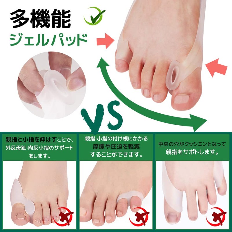 - 【商品機能】外反母趾や内反小指を同時にサポート。改良版としてスペーサーを中央の穴に挿入することでがより良いクッションとなって、内側に傾いた親指を正しい位置に導き痛みを和らげ、親指と人差し指の2指間に、小指と薬指の2指間に適度な間隔を保ちなが足指への負担を軽減し、足指を優しく広げマッサージします。ぷにぷにとしたジェルパッドが圧力や摩擦から突起部を優しく包み込むので、履物と足の接触を和らげ、衝撃や靴ずれから保護します。