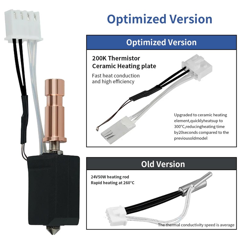 - Rapid Heating Performance The ceramic heating element allows the hotend to reach 220°C in approximately 38 seconds, offering more than three times the heating speed of the original setup. This enhancement reduces print preparation time significantly. Warm Tip: When replacing nozzles, especially the 0.2mm size, be cautious of residual adhesive used in factory installations. If the nozzle is difficult to remove, applying gentle heat can help loosen it.