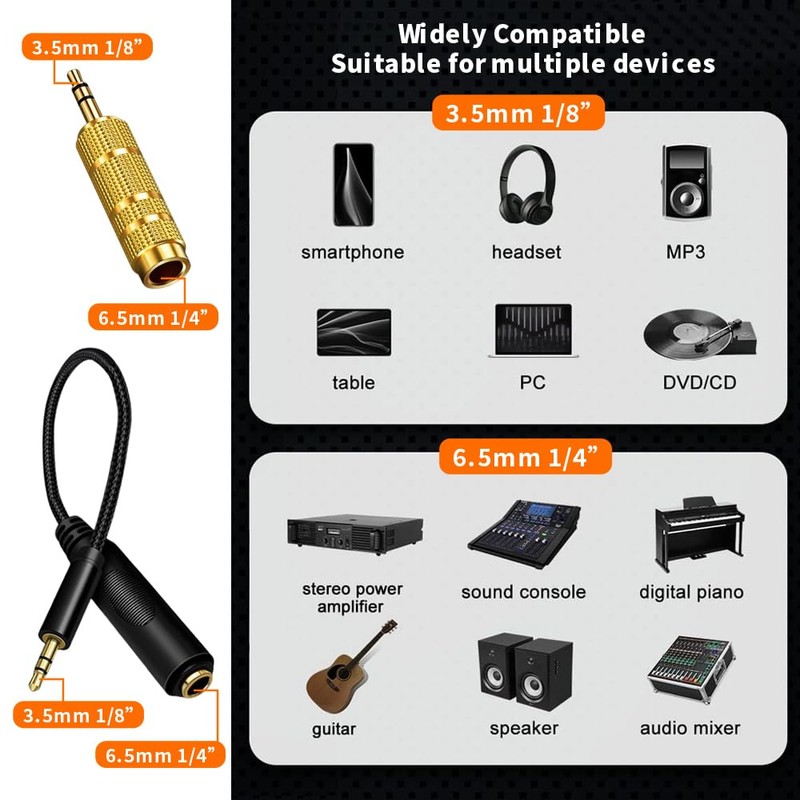 - 1/4 to 3.5mm Adapter (6.35mm female to 3.5mm male) can transfer audio between 3.5mm devices(smartphones, laptops, or headphones) and 6.35mm devices(amplifier, guitar, piano, mixing console, home stereo system...). Eg: 6.35mm headphone to computer adapter, amplifier to headphones/3.5mm speaker adapter, piano to 3.5mm adapter, guitar to speaker adapter, etc. [NOTICE: Please rotate plugs gently, make sure they have been put into the jack absolutely.]