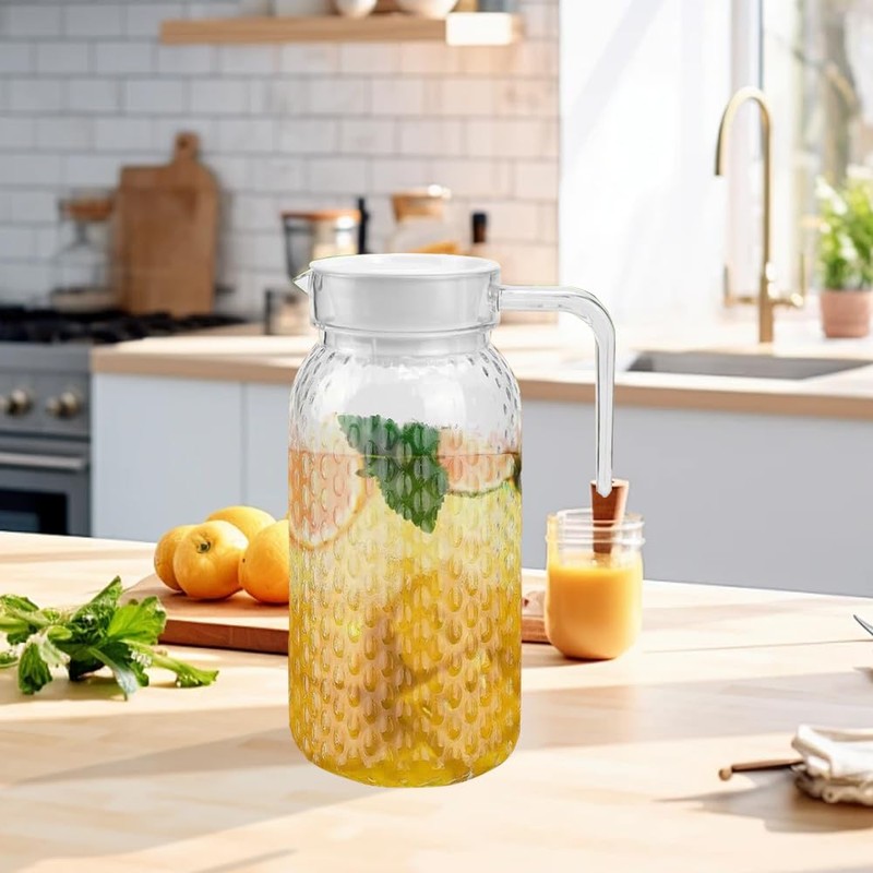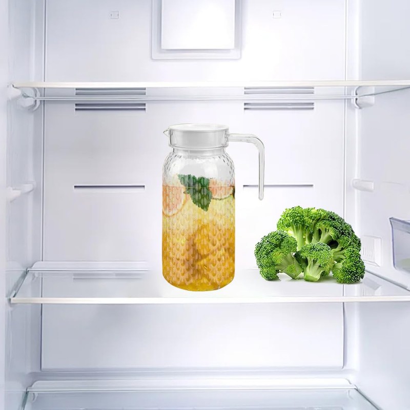 - 【High Quality】The water jug with lid is made of high-quality acrylic material, which is durable.The lid prevents spills.Durable and easy cleaning.It is more resistant to falling and pressure than glass, and is safer to use.Juice jar withstands cold, hot or boiled beverages.