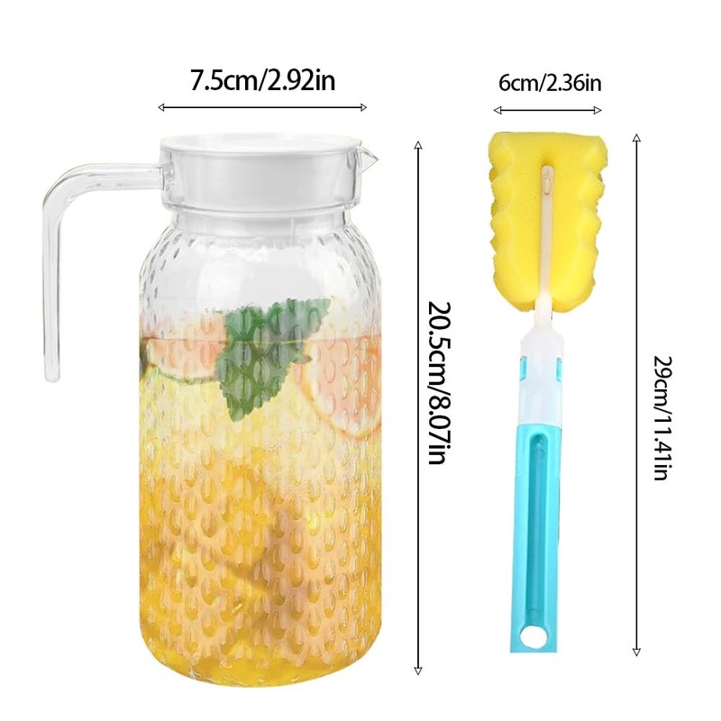 - 【Unique Design】The wide opening design of the jar facilitates manual cleaning of the bottom and can be placed in a dishwasher for easy maintenance. A wide mouthed glass water bottle is also very suitable for placing ice cubes, large pieces of fruit, and tea bags in a kettle. The transparent bottle of the acrylic pitcher allows you to see the status of the drink at a glance, making it easy to grasp the remaining amount.