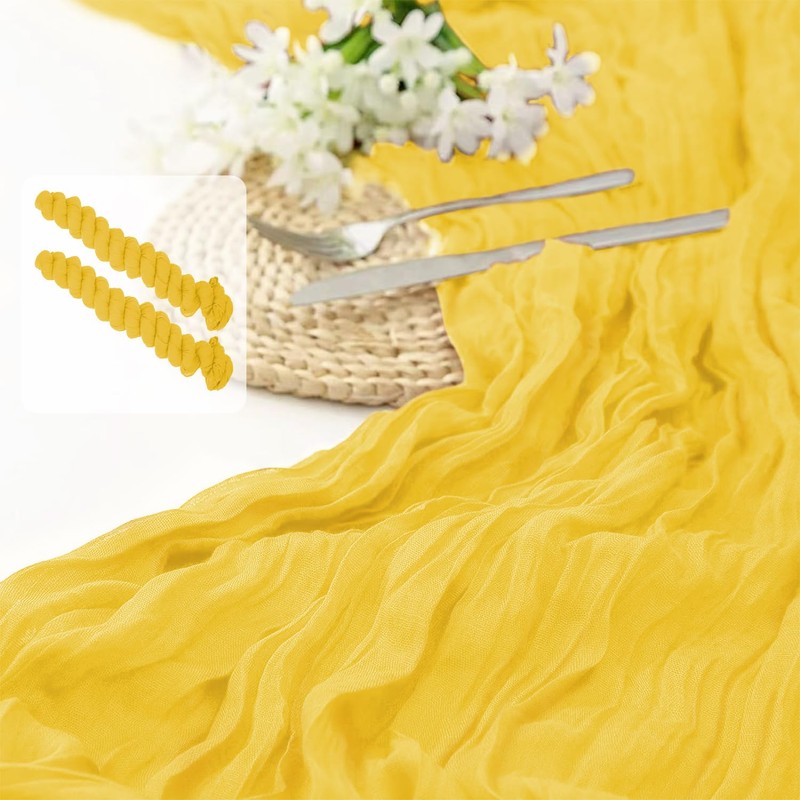 - 【Package Included】2 pcs Light Yellow Cheesecloth Tablecloth (35" x 120"/10ft). The design is elegant and beautiful, and the workmanship is exquisite. The table runner has a rustic and elegant look that pairs well with bohemian, farmhouse, chic, or other modern themes.