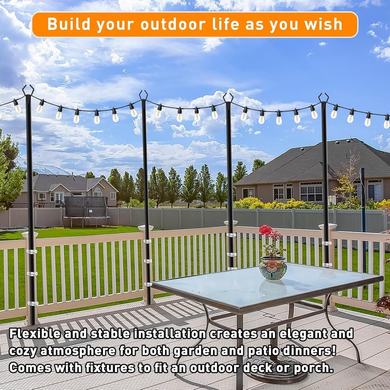 - VERSATILE & STYLISH DESIGN: These modern string light poles blend elegant aesthetics with multi-functional practicality, perfect for enhancing any indoor or outdoor space. The sleek black finish and minimalist silhouette effortlessly complement both contemporary and traditional decor, while adding a warm, romantic ambiance to:Private gardens, patios, courtyards, Family gatherings, wedding, restaurant terraces, holiday markets, festival lighting & temporary installations