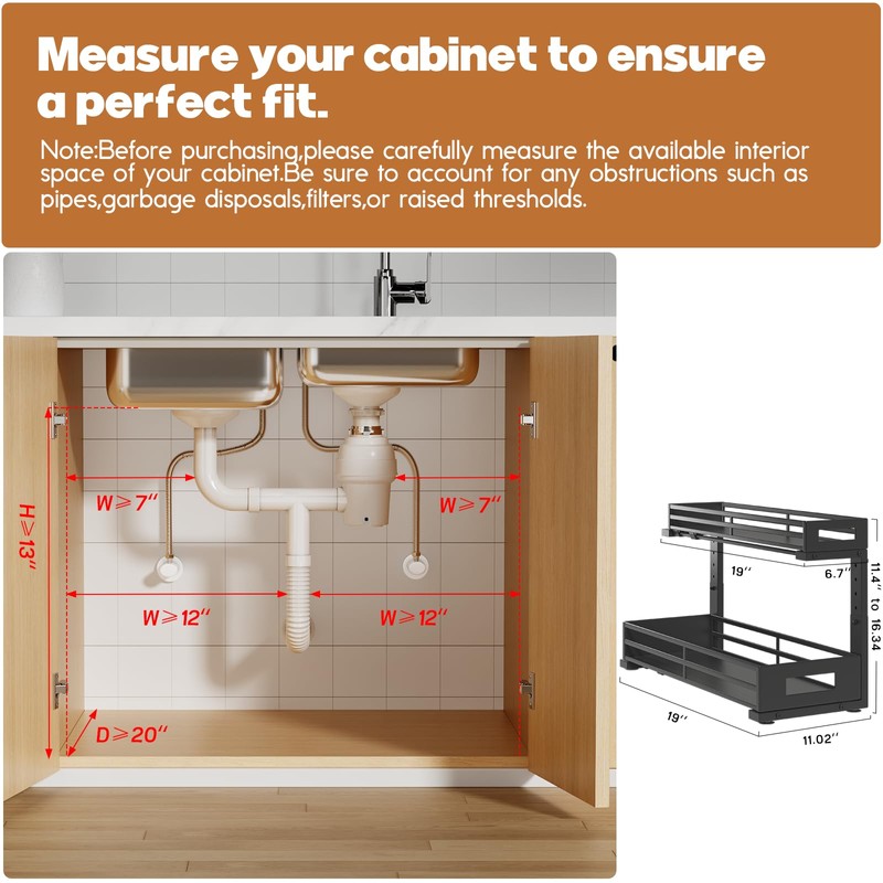 - 【Smart L-Shaped Design 】The innovative L-shaped structure is specially designed to navigate around complicated under-sink obstacles.Whether your cabinet includes a garbage disposal, water filter, or irregular plumbing pipes, this organizer fits snugly without wasting space.Maximize every inch of storage—even in tight, awkward cabinet areas.