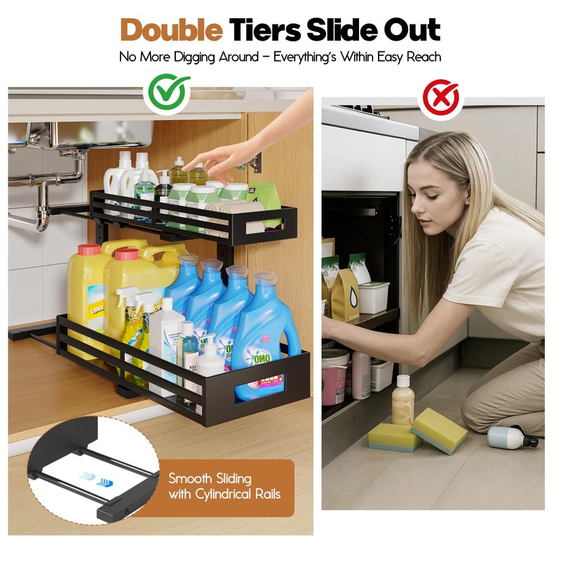 - 【Upgraded Anti-Tip Slide Rails】Built with durable round tube slide rails,Both upper and lower tiers slide out smoothly for easy access.No more digging around—quickly grab what you need from the front or back.Anti-tip locking system prevents tilting when fully loaded.