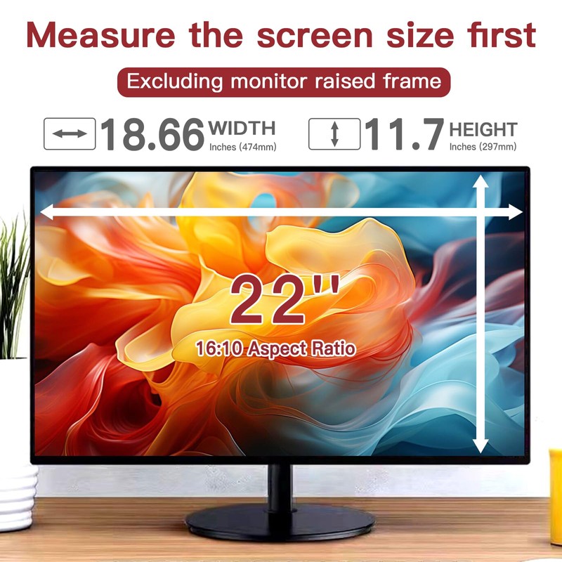 - 【22 Inch 16:10 Privacy Filter Dimensions】Not for 22 Inch with 16:9 (like 1920x1080) Resolution. Width:18 11/16" (474 mm), Height: 11 11/16" (297 mm), Diagonal: 22" (558.8 mm), 16:10 Aspect Ratio - This ANTOGOO V privacy screen for computer monitor 22 inch is specially designed for 22in HP, Samsung, Dell, Lenovo, Acer, Asus, LG, ViewSonic and other brands of monitors. Please check the width and height dimensions of the display area of your computer screen (excluding the black border) before purchasing. If you can't confirm, please let us know for help.