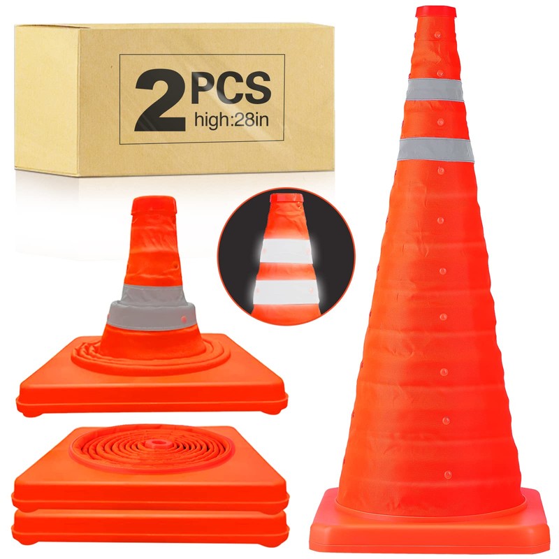 - 【2 Packs Safety Cones Set】You will receive 2 Safety Cones.The height of the Safety Cones is 28 inches, the base is11.8*11.8 inches, and the height after storage is 1.58 inches. It takes up little space and is very convenient to use.