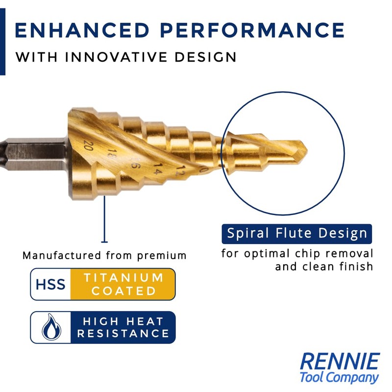 - 2 flute spiral groove step drill - Gives a good fast and smooth cut. 4-20mm - This metric step drill has 9 steps - 4mm 6mm 8mm 10mm 12mm 14mm 16mm 18mm and 20mm. So you can drill accurate holes to any of these sizes.