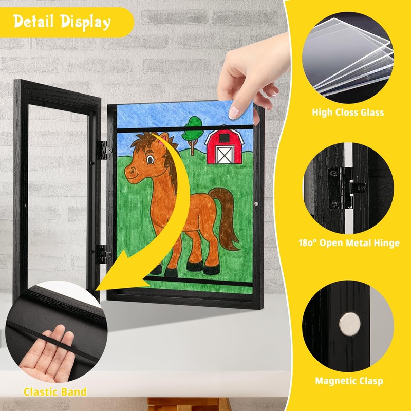 - 🍅 Easy to Hang --- 180° front-opening interchangeable frame, and can be hung in both horizontal and vertical orientations. It's secured with an elastic band and has a clear view glass. This flexibility makes it easy for children to change up their paintings drawings whenever they want, showcasing their creativity in new and exciting ways.