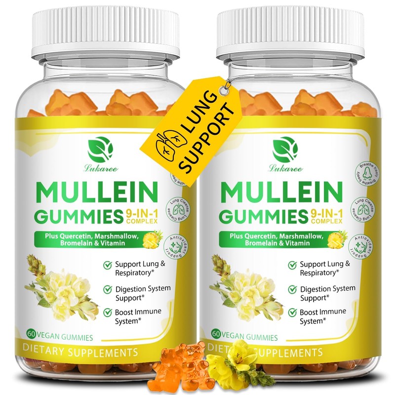 (2 Pack) 9 in 1 Mullein Gummies for Lung Cleanse & Detox, Extra Strength Mullein Leaf Extract w/Quercetin, Bromelain, Elderberry & Marshmallow for Respiratory, Immune & Digestive, Vegan,120 Count