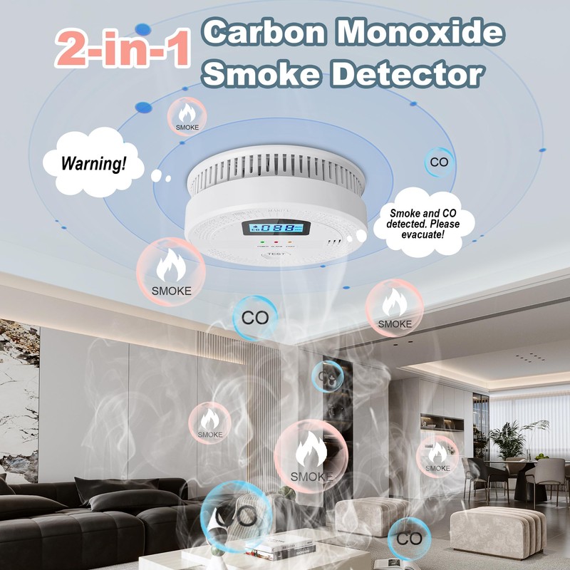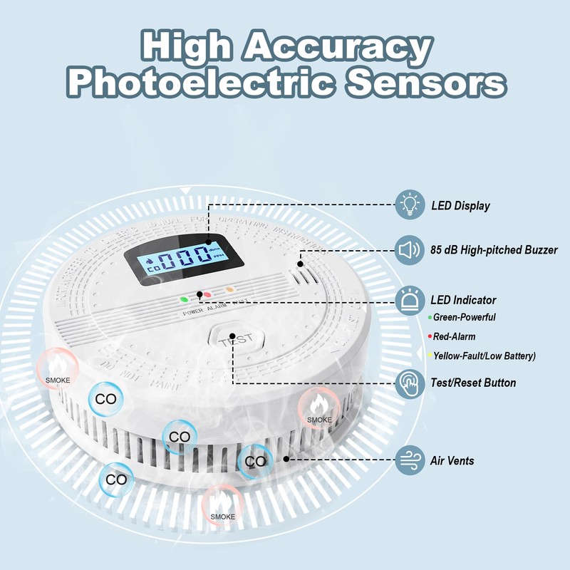 - 2-in-1 Sensitive Alarm: Smoke and carbon monoxide detectors adopt photoelectric and electrochemical sensor designs,which can detect the hazardous smoke and CO gases simultaneously and effectively.